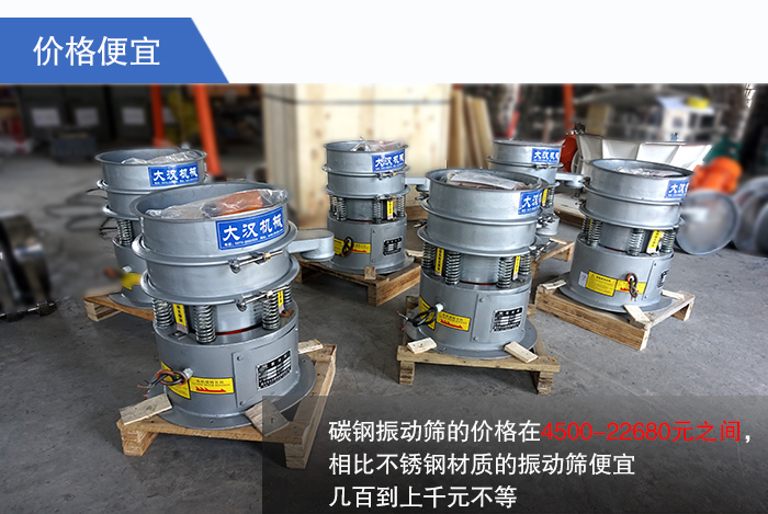 碳鋼振動篩的價格在4500-22680元之間,相比不銹鋼材質的振動篩便宜幾百到上千元不等,除食品、醫藥、化學等對于衛生要求較高以外的用戶和企業都可以選擇碳鋼材質的振動篩,直線篩因為在型號和體積上比選擇要多和大,所以就算是和同材質的旋振篩相比價格上也會高出一些。