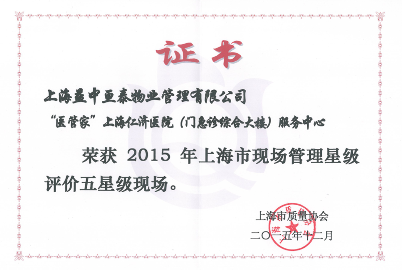 現(xiàn)場(chǎng)管理是企業(yè)管理的核心組成部分,是企業(yè)發(fā)展的堅(jiān)實(shí)基礎(chǔ)。2015年12月,上海益中亙泰物業(yè)管理有限公司(醫(yī)管家)上海仁濟(jì)醫(yī)院以及上海第三人民醫(yī)院(門(mén)急診綜合大樓)服務(wù)中心分別榮獲2015年上海市現(xiàn)場(chǎng)管理星級(jí)評(píng)價(jià)五星級(jí)現(xiàn)場(chǎng)和四星級(jí)現(xiàn)場(chǎng)。