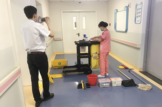 本次比賽歷時(shí)兩天,開(kāi)設(shè)管理人員理論考試、保潔車擺放、病房保潔六步工作法、平車運(yùn)送、輪椅運(yùn)送、秩序維護(hù)隊(duì)列展示、消防演練、會(huì)務(wù)禮儀操、會(huì)務(wù)服務(wù)、有壓水管連接、工程星三角啟動(dòng)等考核模塊。每一位參賽選手的操作經(jīng)過(guò)現(xiàn)場(chǎng)工作人員的實(shí)時(shí)視頻拍攝傳輸?shù)娇偛康碾娮悠聊?,由評(píng)委按照比賽細(xì)則進(jìn)行認(rèn)真打分。當(dāng)每一個(gè)操作,每一個(gè)動(dòng)作在鏡頭中被無(wú)限放大,我們才會(huì)知道醫(yī)院后勤服務(wù)沒(méi)那么簡(jiǎn)單,標(biāo)準(zhǔn)化服務(wù)也不是一句口號(hào)。比如說(shuō)五色毛巾的正確疊法,會(huì)務(wù)倒水時(shí)身體傾斜的角度,使用滅火器時(shí)距離火源的距離、為患者陪檢前核對(duì)每一項(xiàng)信息.... 功在平時(shí),臺(tái)下十年功才造就了臺(tái)上精彩的一分鐘。