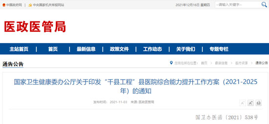 11月3日,國家衛(wèi)生健康委辦公廳發(fā)布 《關(guān)于印發(fā)“千縣工程”縣醫(yī)院綜合能力提升工作方案(2021-2025年)的通知》(以下簡稱《通知》)。
