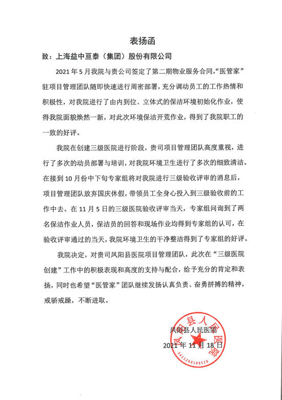 “醫(yī)管家”與鳳陽縣人民醫(yī)院攜手合作近6載,在此次院方“三級(jí)醫(yī)院創(chuàng)建”工作中,高度重視,積極配合,多次動(dòng)員進(jìn)行周密部署,加強(qiáng)員工專業(yè)能力培訓(xùn),對(duì)院方環(huán)境衛(wèi)生嚴(yán)格管控;國慶期間項(xiàng)目團(tuán)隊(duì)放棄休假,全身心投入到三級(jí)驗(yàn)收前的準(zhǔn)備工作中;在三級(jí)評(píng)審過程中,專家組隨機(jī)詢問現(xiàn)場保潔人員,對(duì)保潔人員的現(xiàn)場作業(yè)及專業(yè)性回答表示高度認(rèn)可,給予滿分好評(píng);院方也對(duì)“醫(yī)管家”長期的優(yōu)質(zhì)服務(wù)及本次三級(jí)評(píng)審中的表現(xiàn)表示贊賞,并給予獎(jiǎng)勵(lì)。