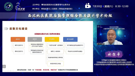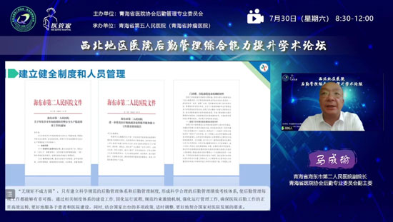 7月30日,由青海省醫(yī)院協(xié)會后勤管理專業(yè)委員會主辦、青海省第五人民醫(yī)院(青海省腫瘤醫(yī)院)承辦的“西北地區(qū)醫(yī)院后勤管理綜合能力提升學(xué)術(shù)論壇”成功舉辦。此次學(xué)術(shù)論壇,采取線上直播的方式,來自上海、天津、甘肅、青海等地知名醫(yī)院后勤管理專家齊聚云端,共同分享全國醫(yī)院后勤管理的最新理論成果和實踐經(jīng)驗,促進西部地區(qū)醫(yī)院之間的學(xué)習(xí)與交流。