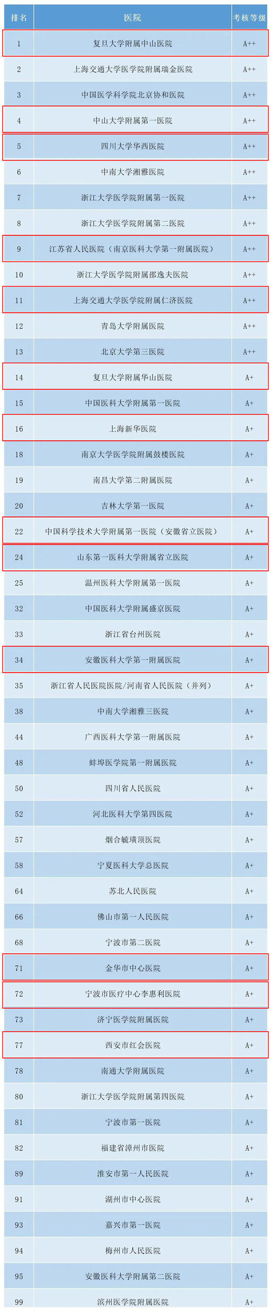 “醫(yī)管家”在此真誠的祝賀合作的復(fù)旦大學(xué)附屬中山醫(yī)院在激烈的競(jìng)爭(zhēng)中一躍摘得桂冠,與中山大學(xué)附屬第一醫(yī)院、四川大學(xué)華西醫(yī)院、江蘇省人民醫(yī)院、上海交通大學(xué)醫(yī)學(xué)院附屬仁濟(jì)醫(yī)院躋身全國(guó)三級(jí)綜合性醫(yī)院前1%的A++最高評(píng)級(jí)隊(duì)伍。復(fù)旦大學(xué)附屬華山醫(yī)院、上海新華醫(yī)院、安徽省立醫(yī)院、山東第一醫(yī)科大學(xué)附屬省立醫(yī)院、安徽醫(yī)科大學(xué)第一附屬醫(yī)院十幾家合作伙伴喜獲A+評(píng)級(jí)。
