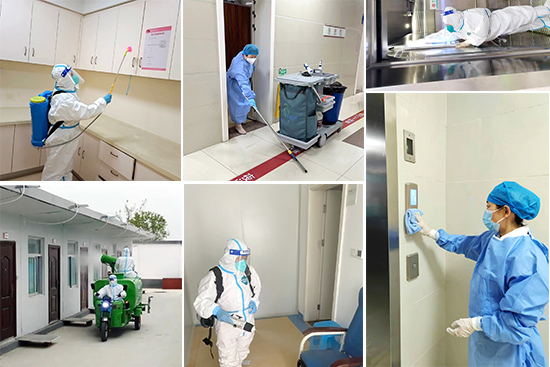 “疫情蔓延,人人都要直面;抗擊疫情,人人都需行動(dòng)?!边@已經(jīng)是當(dāng)前每一名后勤人的共識(shí)。根據(jù)山東省各市防疫應(yīng)急預(yù)案,“醫(yī)管家”各項(xiàng)目團(tuán)隊(duì)立即提升了消殺等級(jí),嚴(yán)格遵循“全覆蓋、無死角、無空白”消殺原則,全面升級(jí)消殺戰(zhàn)斗力。早上5點(diǎn),當(dāng)大多數(shù)人還在熟睡時(shí),由保潔、輔醫(yī)組成的消殺小組就已穿上密不透風(fēng)且厚重的防護(hù)服,變身“大白”,投身戰(zhàn)斗崗位。消殺組人員24小時(shí)隨時(shí)待命,輪班交替,每天通過消殺桶、消殺車等工具,對各大院區(qū)公共區(qū)域進(jìn)行高頻消殺,尤其針對高觸點(diǎn)的電梯、把手、欄桿,以及各樓層的垃圾桶都進(jìn)行逐一多次的擦拭、消毒、消殺等處理,一天下來,消殺面積總和達(dá)到50多萬平方米。