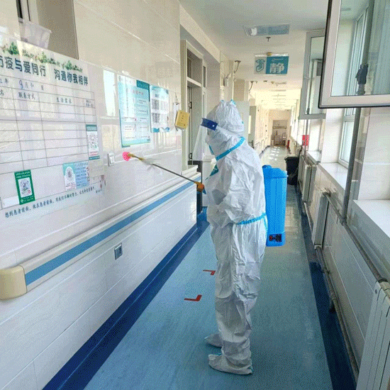 從凌晨到深夜,隨時(shí)都能看到保潔的身影忙碌在醫(yī)院的角角落落。他們每天穿著密不透風(fēng)的防護(hù)服,戴著防護(hù)帽、防護(hù)面屏、口罩和手套,肩負(fù)沉重的消殺桶,同樣的動作要重復(fù)成百上千遍,同樣的路要走十幾趟,肩膀、腳底起泡已是家常便飯。正值秋冬交替,天氣溫差極大,忽冷忽熱,但他們絲毫不松懈,嚴(yán)格落實(shí)疫情期間全院消毒時(shí)間、消殺頻次。面對令人望而卻步的發(fā)熱門診、隔離病區(qū),他們“疫”無反顧,用專業(yè)保障每一處環(huán)境的安全。他們每天與時(shí)間賽跑,同病毒較量,就如一枚螺絲釘,默默無聞卻至關(guān)重要。