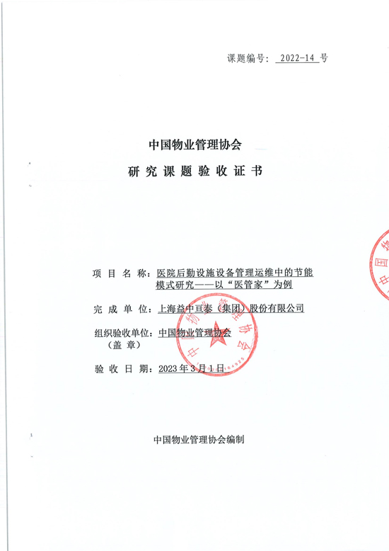 此次益中亙泰承擔(dān)的《醫(yī)院后勤設(shè)施設(shè)備管理運(yùn)維中的節(jié)能模式研究——以“醫(yī)管家”為例》研究課題,經(jīng)過(guò)專(zhuān)家評(píng)審組評(píng)審一致認(rèn)為,達(dá)到了國(guó)內(nèi)物業(yè)管理行業(yè)領(lǐng)域研究的先進(jìn)水平,在物業(yè)管理實(shí)踐中具有指導(dǎo)意義和推廣前景,予以通過(guò)驗(yàn)收。這是對(duì)益中亙泰一貫以來(lái)在醫(yī)院物業(yè)管理領(lǐng)域的不斷探索和努力的肯定,也是行業(yè)高度認(rèn)可的有力證明。