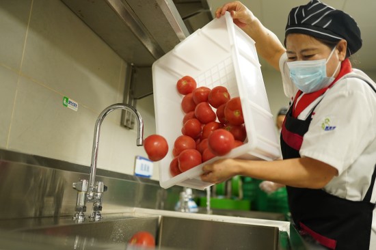 城市還在酣睡時(shí),后廚人員采購(gòu)的新鮮菜品開(kāi)始過(guò)“手作安檢”。阿姨們精挑細(xì)選,每一片帶著大自然氣息的葉菜,在水流中被洗凈,將脆度鎖在梗里。我們堅(jiān)信,唯有經(jīng)過(guò)雙手的溫柔篩選,食材的生命力才得以被真正喚醒。手洗從不是復(fù)古儀式,而是飽含自然最初的鮮活與恰到好處的溫度。