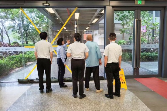 臺風未至,行動先行?!搬t(yī)管家”全員戒備,進入24小時值班值守狀態(tài),結(jié)合過往應對暴雨防汛的工作經(jīng)驗,聯(lián)動氣象部門與院方要求建立“分鐘級”預警機制,圍繞六大核心任務展開全覆蓋、地毯式排查與布防,有序開展防臺防汛工作:一是全面排查院區(qū)漏水隱患,用防水膠帶、密封膠等材料即時封堵,筑牢防滲第一關(guān);二是全員出動徹底疏通全院排水溝,確保暴雨期間排水暢通無阻;三是系統(tǒng)修剪臨近建筑及供電線路的樹木枝干,提前消除高空墜物風險;四是在地下車庫入口、配電室、低洼診室等重點區(qū)域科學布設沙袋與擋水板,構(gòu)筑堅固的防水壁壘;五是完成全院門窗閉合情況巡查,確保所有門窗閉鎖牢固,有效抵御強風沖擊;六是對室外綠植及設施進行全面加固或轉(zhuǎn)移,杜絕次生安全隱患。