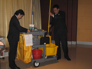 這次培訓的主要內容是:(一)保潔車擺放及日常保潔標準化;(二)保潔專項及硬地面保養(yǎng)程序;(三)保潔表格的日常運用;(四)生物危害控制與管理教程;(五)現(xiàn)場培訓演習。