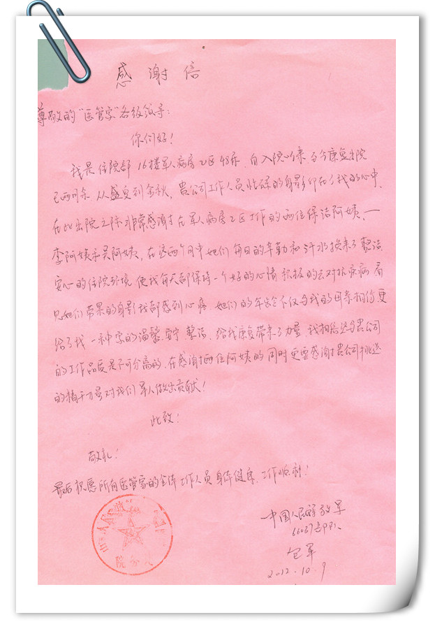 “醫(yī)管家”天津中國人民解放軍第二五四醫(yī)院服務(wù)中心,自新住院部5月底正式營業(yè)以來,經(jīng)過幾個月的緊張調(diào)整與磨合,得到了院方以及病患的廣泛認(rèn)可。本項目陸續(xù)收到表揚信以及感謝信,其中有環(huán)境管理拾金不昧的感謝信、有電梯駕駛微笑服務(wù)的感謝信、有對辛苦工作任勞任怨保潔員的聯(lián)名表揚信等。一年了,我們等到了收獲的季節(jié),在此對項目所有的同事表示感謝,同時道一聲你們辛苦了!