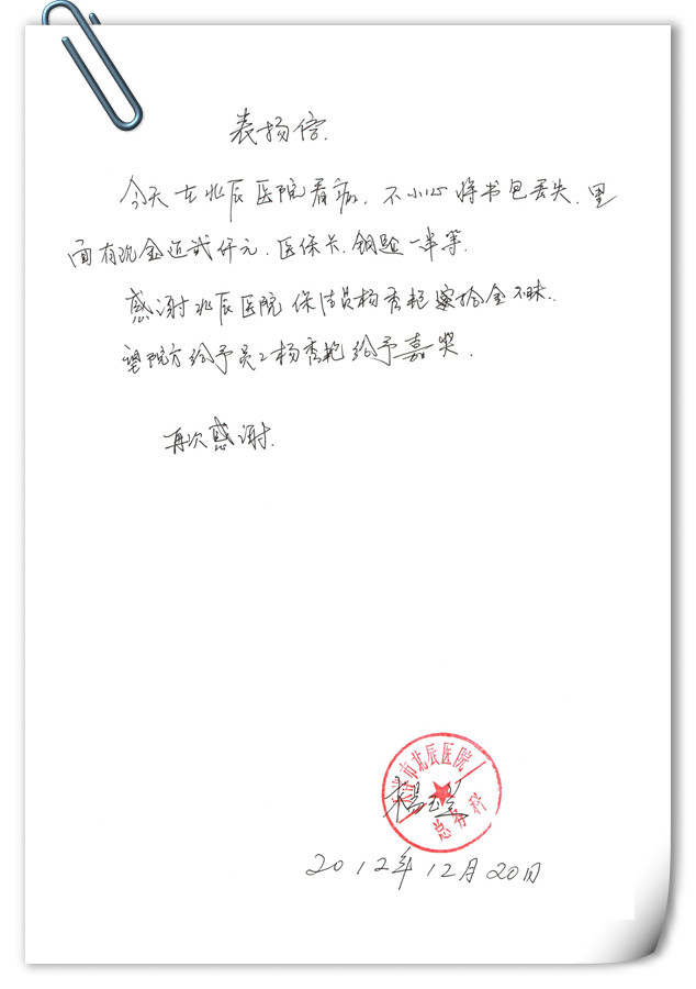 失主是一名64歲的女性退休老教師,經(jīng)過確認(rèn)劉主管將書包歸還于老教師,老教師萬分感激,當(dāng)場寫下表揚(yáng)信交予院方總務(wù)科李科長。李科長對(duì)于我們的環(huán)境管理部員工楊秀艷的拾金不昧表示高度贊揚(yáng),夸獎(jiǎng)我們“醫(yī)管家”人有像金子一樣閃閃發(fā)光的心靈!