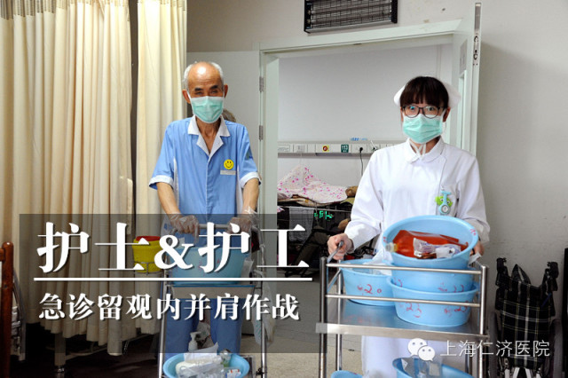 急診留觀病房內(nèi),護士姑娘和“醫(yī)管家”護工老師傅推著滿載藥物的治療車,準(zhǔn)備開始一天的治療工作。