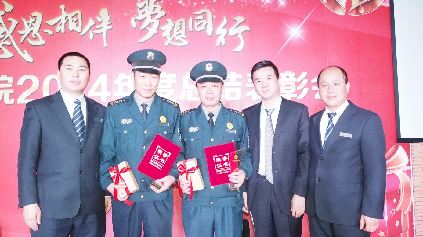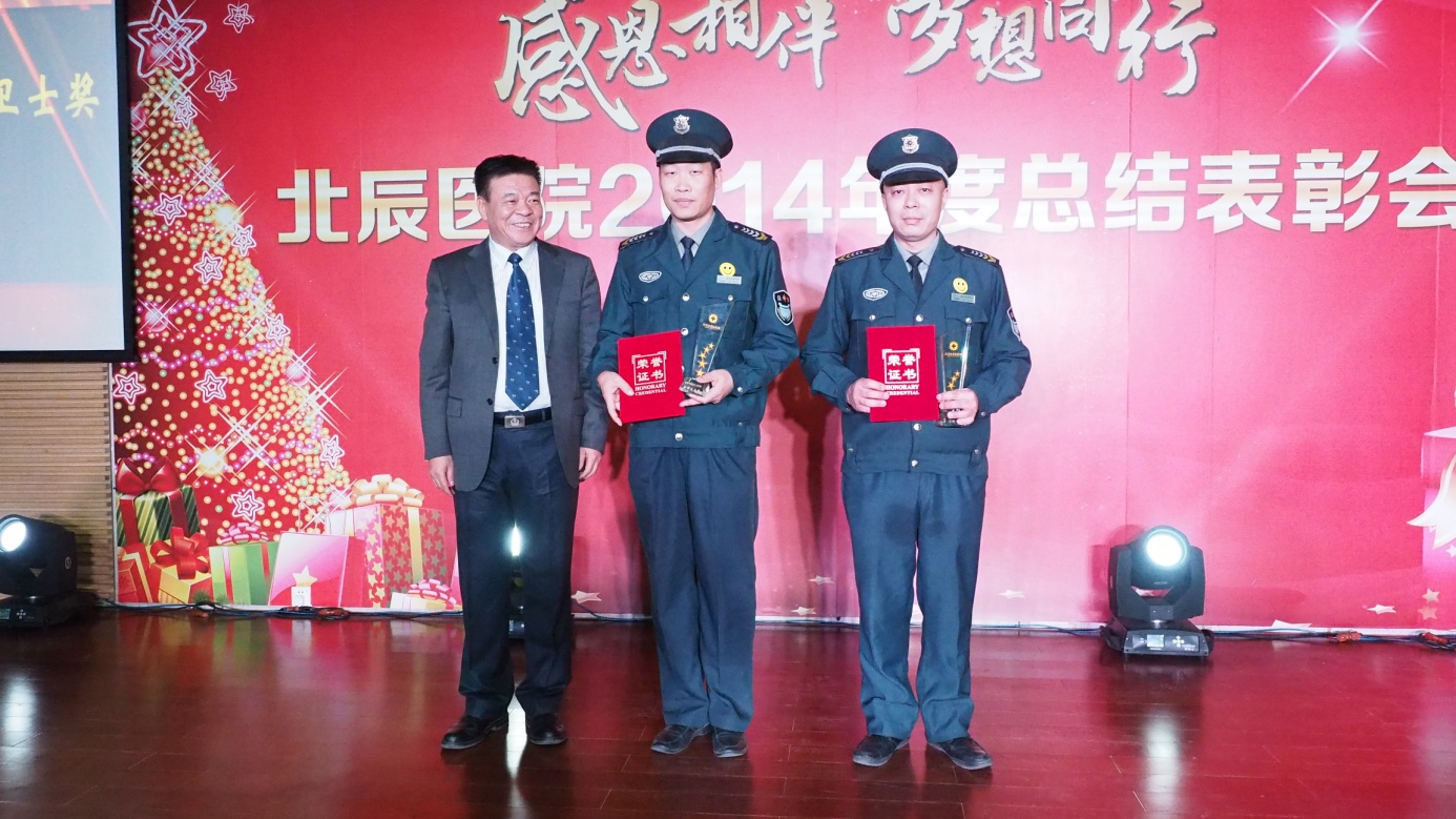 2014年12月24日平安夜,天津市北辰醫(yī)院年終總結(jié)表彰大會(huì)在門診三樓報(bào)告廳舉行,參加表彰會(huì)的有許建輝院長和衛(wèi)生局劉文利局長,被表彰的都是北辰醫(yī)院辛勤付出表現(xiàn)優(yōu)秀的老師們?!搬t(yī)管家”秩序維護(hù)部員工李晨、李衛(wèi)軍有幸被評(píng)為北辰醫(yī)院年度安全衛(wèi)士稱號(hào),這是醫(yī)院領(lǐng)導(dǎo)對(duì)我們工作的肯定,也是“醫(yī)管家”員工辛勤努力工作的結(jié)果。