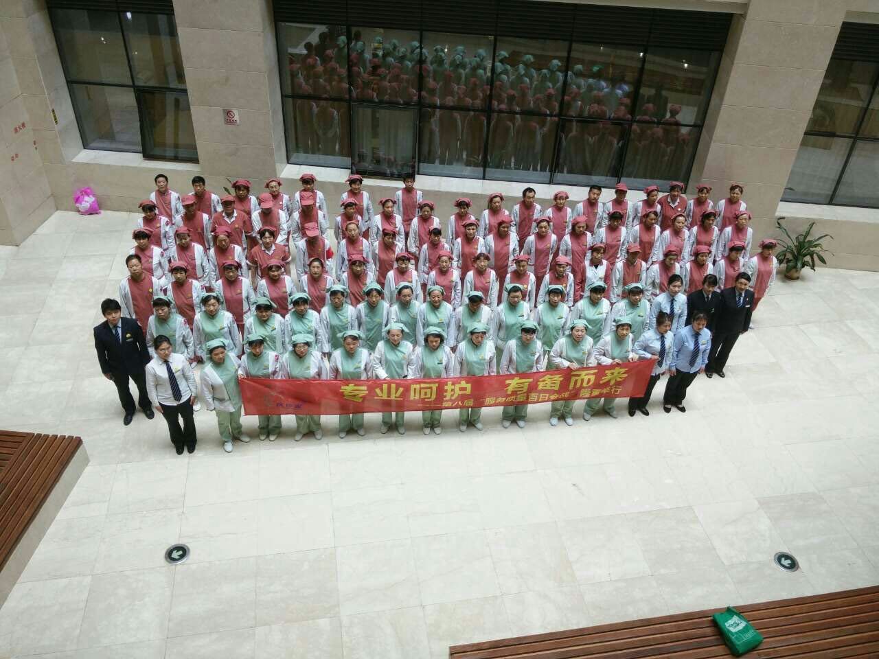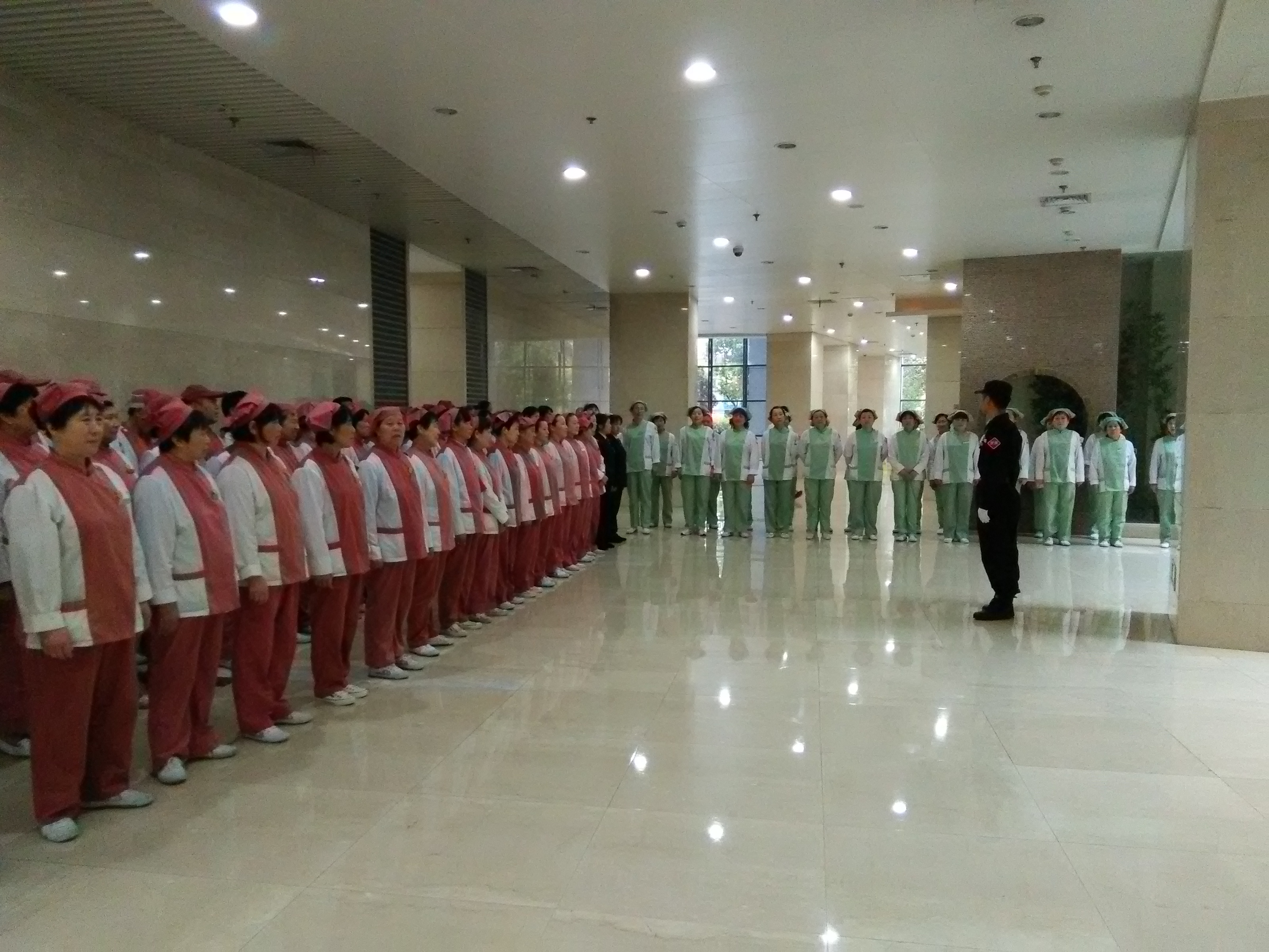 “醫(yī)管家”江蘇省中醫(yī)院服務(wù)中心每季度開展員工軍訓(xùn),旨在提高員工形象、團(tuán)隊(duì)凝聚力。恰逢公司“第八屆服務(wù)質(zhì)量百日會(huì)戰(zhàn)”期間,項(xiàng)目再次開展員工培訓(xùn),宣傳百日會(huì)戰(zhàn)提升員工形象,并將管理人員單獨(dú)訓(xùn)練,從管理人員開始做起。