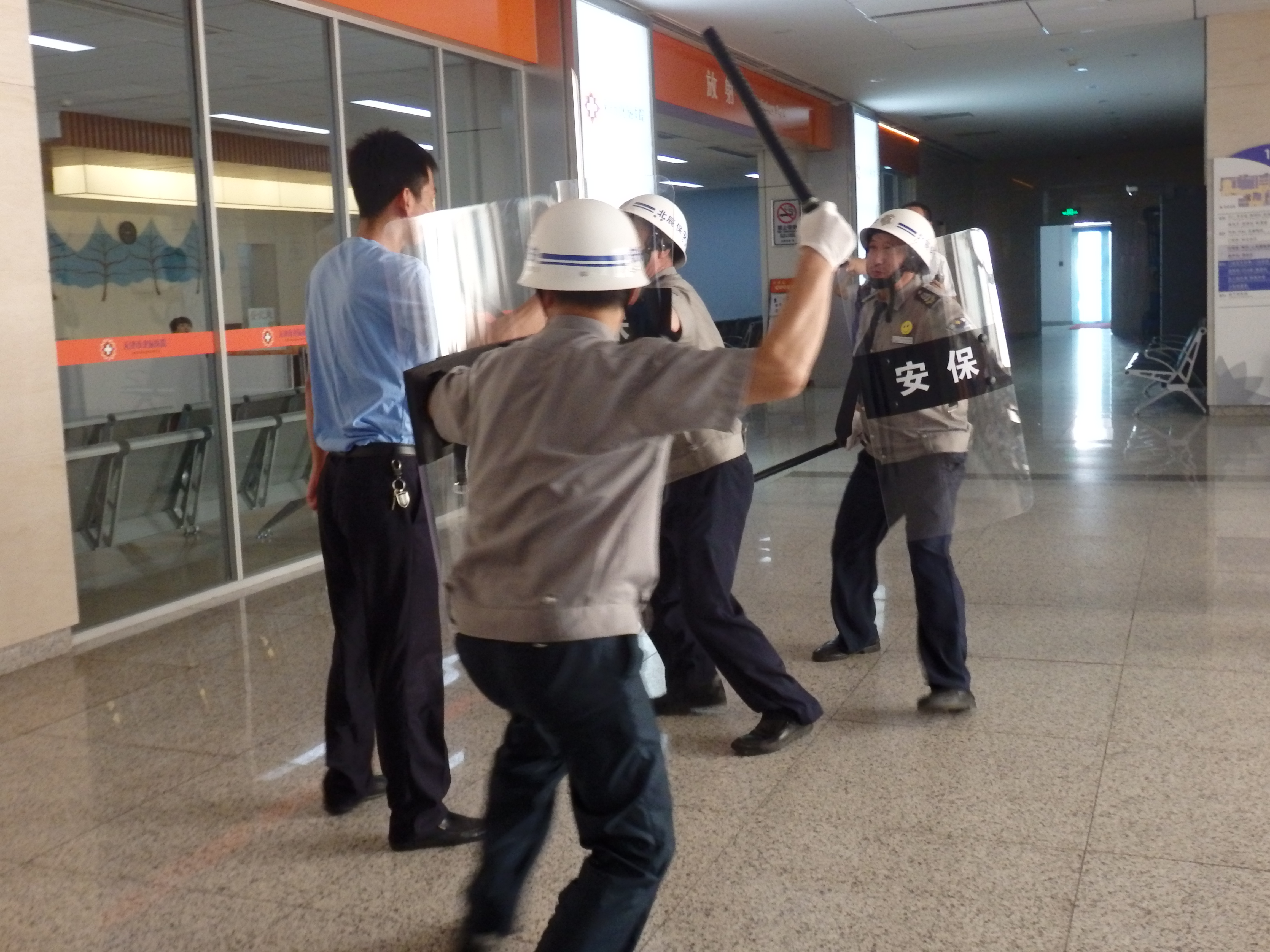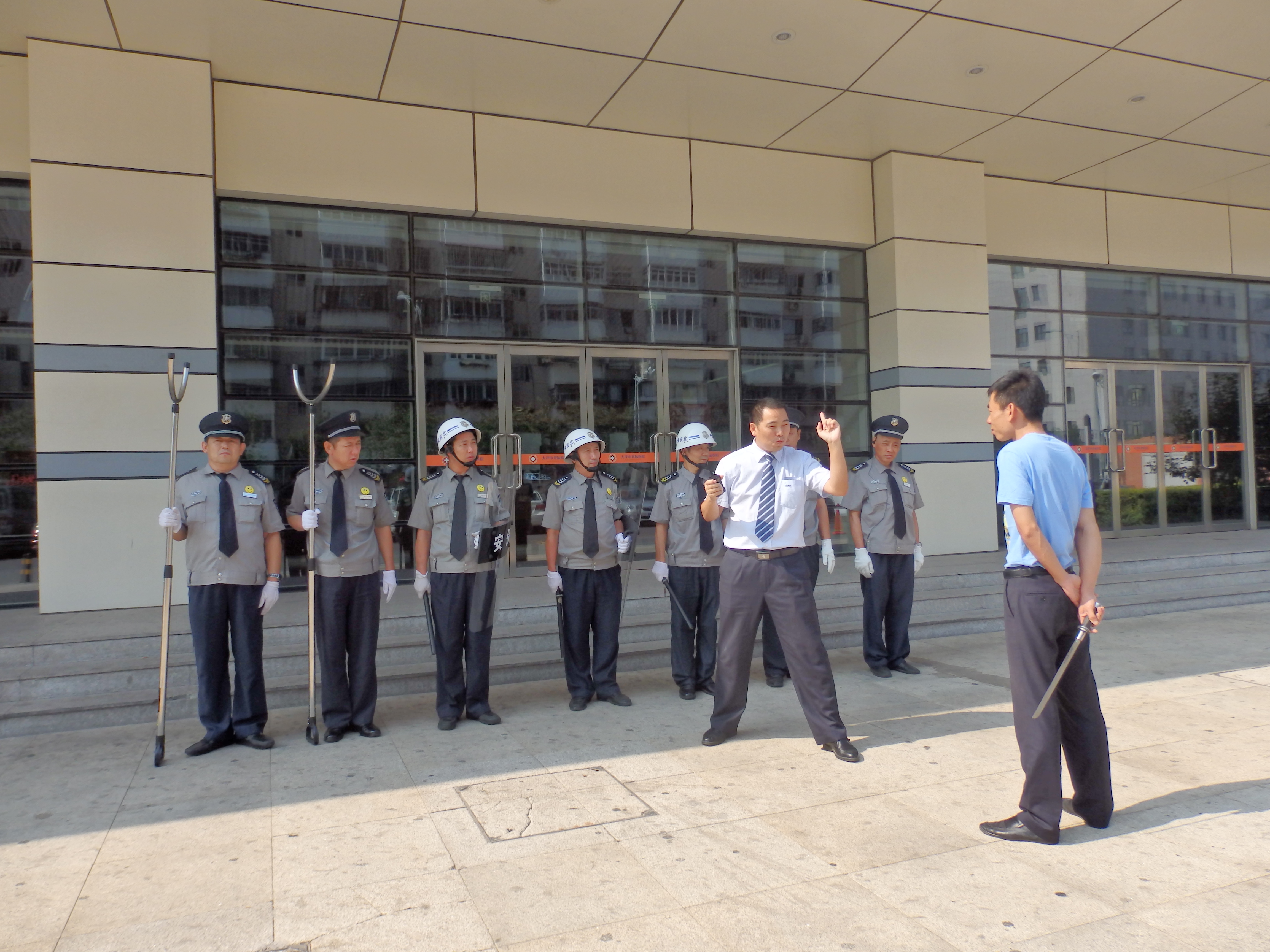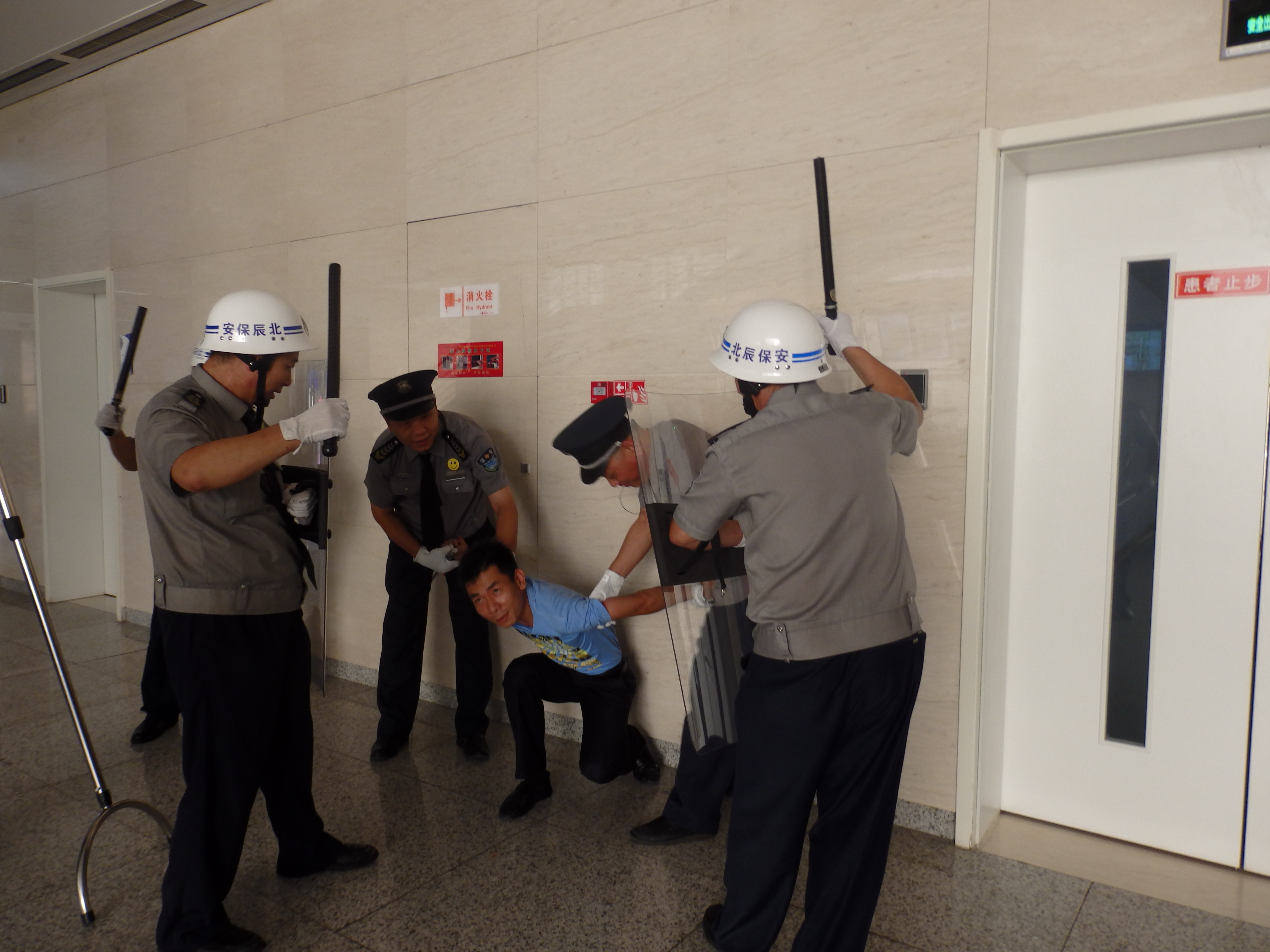 2015年8月29日,為了檢驗(yàn)北辰醫(yī)院“醫(yī)管家”秩序維護(hù)部的“反恐應(yīng)急”能力,保衛(wèi)科長楊壽年和秩序經(jīng)理劉馬俊組織實(shí)施了反恐應(yīng)急演練活動(dòng)。演練假設(shè)發(fā)現(xiàn)1名暴力分子持刀進(jìn)入醫(yī)院行兇,“醫(yī)管家”秩序維護(hù)部迅速啟動(dòng)《反恐應(yīng)急預(yù)案》,及時(shí)上報(bào)劉馬俊經(jīng)理、保衛(wèi)科楊科長及110指揮中心,然后組織人員攜帶防暴裝備迅速趕往事發(fā)地點(diǎn)。到場后及時(shí)疏散周圍群眾,劃出警戒范圍,然后第一梯隊(duì)3人手持防爆盾牌和警棍呈扇形隊(duì)形將暴恐分子逼退到墻邊,第二梯隊(duì)2人手持防爆鋼叉從左右兩側(cè)控制暴恐分子身體自由,第三梯隊(duì)2人佩戴防割手套迅速靠前奪刀,然后將滋事的暴恐分子制服,整個(gè)演練過程在劉經(jīng)理的指揮下緊張有序的進(jìn)行。