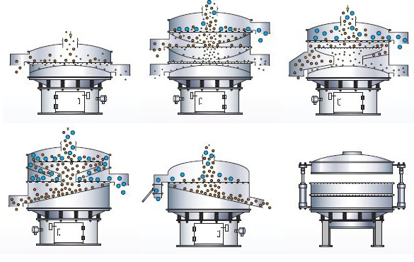 采用立式振動(dòng)電機(jī)作為激振源,通過振動(dòng)電機(jī)上下兩端的偏心重錘將旋轉(zhuǎn)運(yùn)動(dòng)轉(zhuǎn)變?yōu)樗?、垂直、傾斜的三次元運(yùn)動(dòng),并傳遞到旋振篩的篩面上;物料通過入料口進(jìn)入設(shè)備內(nèi),根據(jù)不同物料篩分要求,物料經(jīng)過1-5層采用不同目數(shù)的金屬編織篩網(wǎng)的篩分層,在這個(gè)過程中,位于各層的篩網(wǎng)下的清網(wǎng)裝置(硅膠彈跳球)通過頻率振動(dòng)不斷撞擊篩網(wǎng),使篩網(wǎng)上層物料能夠順暢的透網(wǎng)篩分,并有效解決了物料堵網(wǎng)問題出現(xiàn),不同目數(shù)的物料通過各層對(duì)應(yīng)目數(shù)的篩網(wǎng)后在各層的出料口排出,終實(shí)現(xiàn)篩選除雜或過濾分級(jí)的目的。