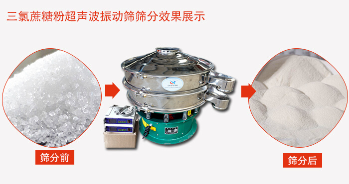 三氯蔗糖粉超聲波振動篩:由于三氯蔗糖粉屬于食品類的一種并且伴有一定的糖粉所以,應該選擇不銹鋼材質的超聲波振動篩進行篩分。
