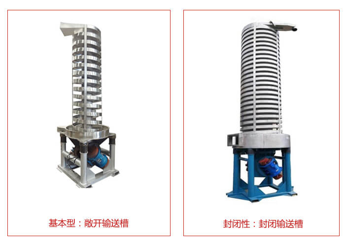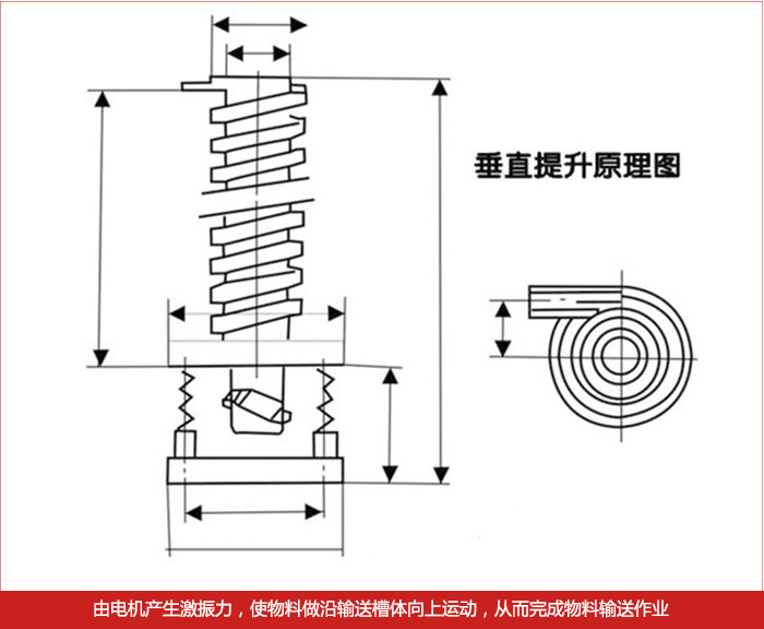 螺旋垂直振動提升機DZC系列垂直振動輸送機的驅(qū)動裝置振動電機安裝在輸送塔下部,兩臺振動電機對稱交叉安裝,輸送塔由管體和焊接在管體周圍的螺旋輸送槽組成,輸送塔座于減振裝置上,減振裝置由底座和隔振彈簧組成。當垂直輸送機工作時,根據(jù)雙振動電機自同步原理,由振動電機產(chǎn)生激振力,強迫整個輸送塔體作水平圓運動和向上垂直運動的空間復合振動,螺旋槽內(nèi)的物料則受輸送槽的作用,作勻速拋擲圓運動,沿輸送槽體向上運動,從而完成物料的向上(或向下)輸送作業(yè)。