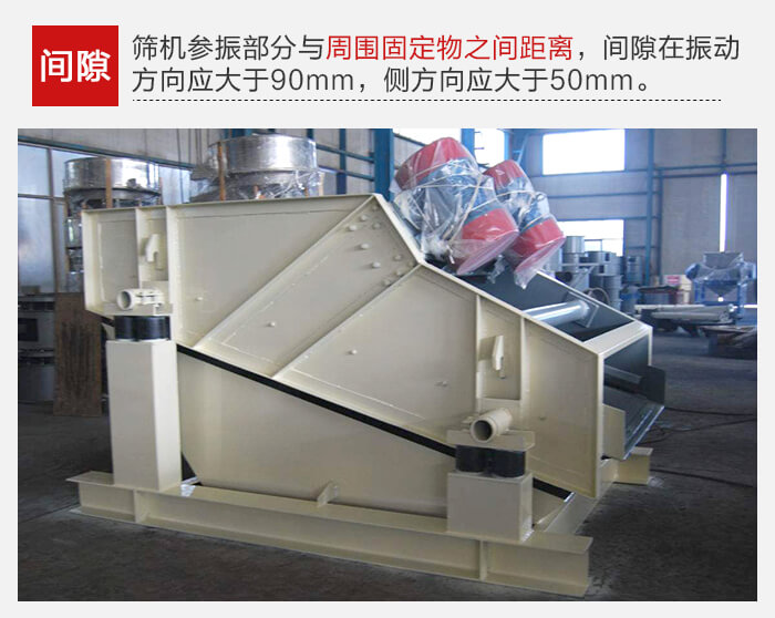 篩機(jī)各部分連接必須牢固可靠,所有螺栓不得有松動(dòng)。篩機(jī)上參振部分與周?chē)潭ㄎ镏g的間隙在振動(dòng)方向應(yīng)大于90mm,在側(cè)方向應(yīng)大于50mm.