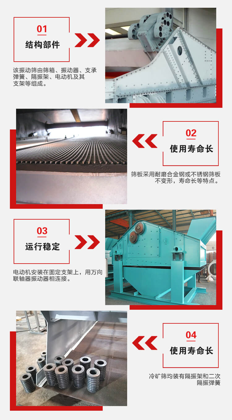 該系列振動(dòng)篩由篩箱、振動(dòng)器、支承彈簧、隔振架、二次隔振彈簧、電動(dòng)機(jī)及其支架等組成。
