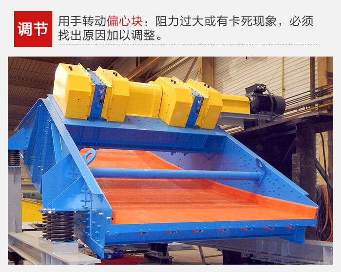 振動(dòng)器裝配完畢后,用手轉(zhuǎn)動(dòng)偏心塊,如阻力過(guò)大或有卡死現(xiàn)象,必須找出原因加以調(diào)整。