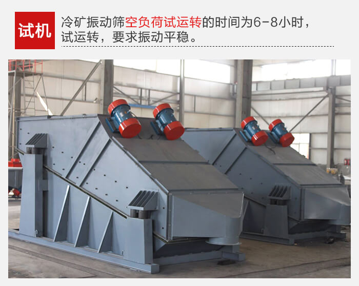 冷礦振動(dòng)篩空負(fù)荷試運(yùn)轉(zhuǎn)的時(shí)間為6-8小時(shí),試運(yùn)轉(zhuǎn),要求振動(dòng)平穩(wěn),無(wú)橫向擺動(dòng)及不正常響聲。如發(fā)現(xiàn)上述問(wèn)題,應(yīng)及時(shí)檢查原因,排除故障。